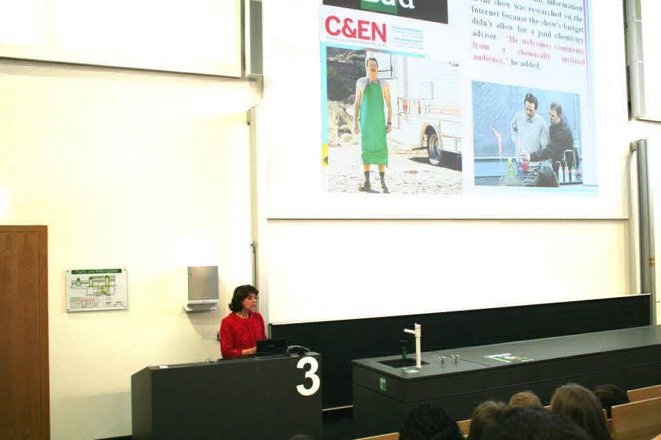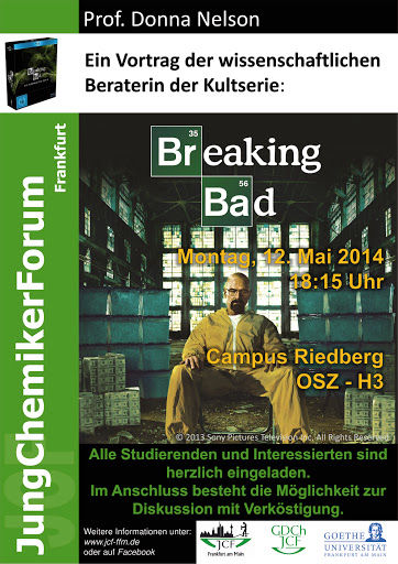 In diesem Jahr durften wir Teil einer ganz besonderen Vortragsreihe werden: Prof. Dr. Donna Nelson (University of Oklahoma), wissenschaftliche Beraterin aus Breaking Bad, kam zu uns an die Universität Frankfurt, um im Rahmen ihrer Braking Bad-Tour Insiderwissen über die US-Kultserie zu präsentieren. Ihr Vortrag "Breaking Bad: My experiences as science advisor to the TV series" gehörte wohl zu den bestbesuchtesten Sommerkolloqien, die wir je ausgerichtet haben und war ein voller Erfolg.