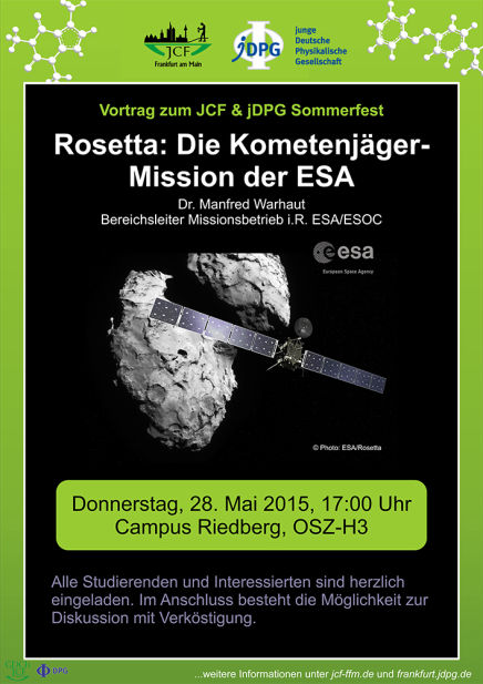 Gemeinsam mit der Jungen Deutschen Physikalischen Gesellschaft boten wir allen Interessierten einen intergalaktisch spannenden Vortrag zum Thema "Rosetta: Die Kometenjäger-Mission der ESA", welcher von Dr. Manfred Warhaut (Bereichsleiter Missionsbetrieb i.R. ESA/ESOC) in spannendster Weise referiert wurde.