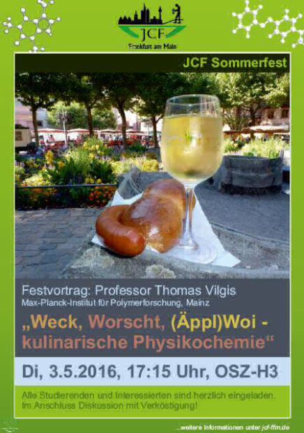 In diesem Jahr brachte Prof. Dr. Thomas Vilgis (MPI für Polymerforschung Mainz) Interessierten "Weck, Woscht, (Äppl)Woi - kulinarische Physikochemie" näher. Nach dem spannenden Festvortrag wurde dem gleich getan und der warme Sommerabend mit angeregten Diskussionen und wohltuender Verköstigung verbracht.